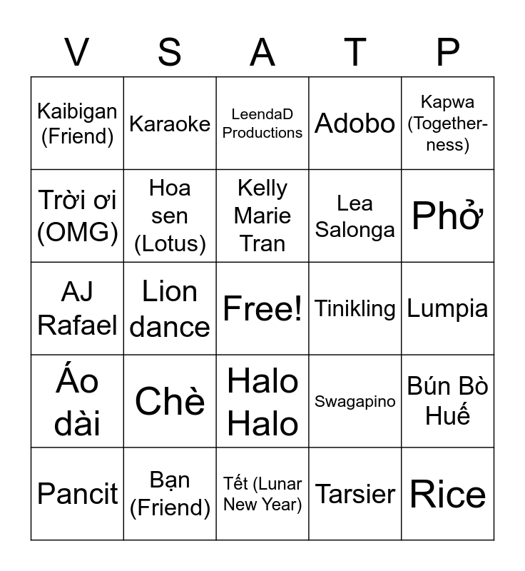 This bingo card has a free space and 47 words: Chổi (Broom), Rice, Chả giò, Tết (Lunar New Year), Chè, Michelle Phan, Karaoke, Mahal Kita (I love you), Trời ơi (OMG), Nursing, Hoa sen (Lotus), Adobo, Bún Bò Huế, Swagapino, Saigon, Nón lá (Conical hat), Kelly Marie Tran, Tinikling, Pamilya, Kapwa (Together-ness), Lion dance, Tarsier, Kaibigan (Friend), Lea Salonga, Walis (Broom), Phở, Pancit, Nước mắm (Fish sauce), Halo Halo, Áo dài, Barong Tagalog, Gia đình (Family), Lupang Hinirang, Bia, Maganda (Beautiful), Bạn (Friend), Lumpia, Ham chơi (Go out too much), Manila, Tình yêu (Love), Tadhana (Fate), LeendaD Productions, AJ Rafael, Y Khoa (Medical), Simbang Gabi (9 days of Christmas mass), Múa sạp (Tinikling) and Sampaguita.