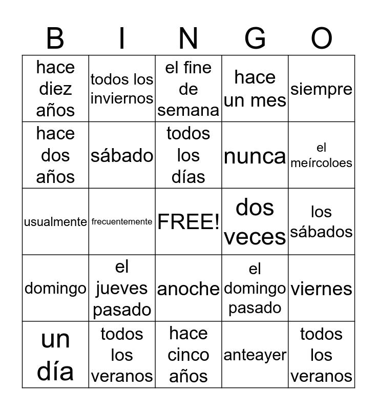 This bingo card has a free space and 24 words: el jueves pasado, todos los veranos, todos los días, un día, siempre, hace diez años, hace dos años, todos los inviernos, dos veces, anoche, nunca, usualmente, el domingo pasado, viernes, sábado, anteayer, los sábados, el fine de semana, el meírcoloes, frecuentemente, todos los veranos, domingo, hace un mes and hace cinco años.