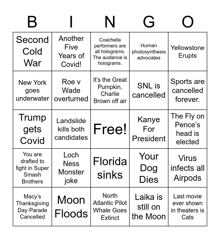 This bingo card has a free space and 25 words: Loch Ness Monster joke, North Atlantic Pilot Whale Goes Extinct, It’s the Great Pumpkin, Charlie Brown off air, Macy’s Thanksgiving Day Parade Cancelled, Yellowstone Erupts, Second Cold War, New York goes underwater, Another Five Years of Covid!, Kanye For President, Florida sinks, SNL is cancelled, Trump gets Covid, Your Dog Dies, Virus infects all Airpods, Roe v Wade overturned, Concerts don’t exist, The Fly on Pence’s head is elected, Coachella performers are all holograms. The audience is holograms., Sports are cancelled forever., Landslide kills both candidates, Last movie ever shown in theaters is Cats, Moon Floods, You are drafted to fight in Super Smash Brothers, Human photosynthesis advocates and Laika is still on the Moon.