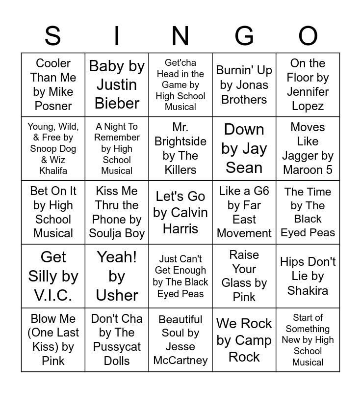 This bingo card has 25 words: Yeah! by Usher, Beautiful Soul by Jesse McCartney, Mr. Brightside by The Killers, Blow Me (One Last Kiss) by Pink, On the Floor by Jennifer Lopez, Cooler Than Me by Mike Posner, Young, Wild, & Free by Snoop Dog & Wiz Khalifa, Baby by Justin Bieber, Like a G6 by Far East Movement, Just Can't Get Enough by The Black Eyed Peas, Down by Jay Sean, Bet On It by High School Musical, Raise Your Glass by Pink, Hips Don't Lie by Shakira, A Night To Remember by High School Musical, Start of Something New by High School Musical, The Time by The Black Eyed Peas, Get'cha Head in the Game by High School Musical, Moves Like Jagger by Maroon 5, Kiss Me Thru the Phone by Soulja Boy, Let's Go by Calvin Harris, Don't Cha by The Pussycat Dolls, Get Silly by V.I.C., Burnin' Up by Jonas Brothers and We Rock by Camp Rock.