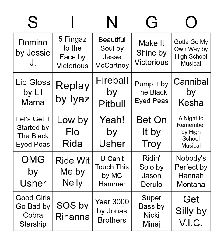This bingo card has a free space and 24 words: Ride Wit Me by Nelly, SOS by Rihanna, Fireball by Pitbull, Good Girls Go Bad by Cobra Starship, Gotta Go My Own Way by High School Musical, Domino by Jessie J., Lip Gloss by Lil Mama, 5 Fingaz to the Face by Victorious, Bet On It by Troy, U Can't Touch This by MC Hammer, Pump It by The Black Eyed Peas, Let's Get It Started by The Black Eyed Peas, Ridin' Solo by Jason Derulo, Nobody's Perfect by Hannah Montana, Replay by Iyaz, Super Bass by Nicki Minaj, A Night to Remember by High School Musical, Beautiful Soul by Jesse McCartney, Cannibal by Kesha, Low by Flo Rida, Get Silly by V.I.C., OMG by Usher, Make It Shine by Victorious and Year 3000 by Jonas Brothers.