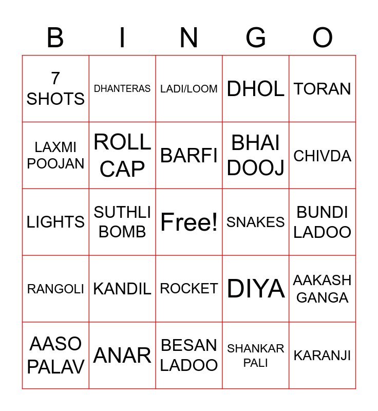This bingo card has a free space and 30 words: ANAR, PHULJHADI, SUTHLI BOMB, JAMIN CHAKRI, 7 SHOTS, LADI/LOOM, ROLL CAP, ROCKET, SNAKES, BESAN LADOO, BUNDI LADOO, KARANJI, SHANKAR PALI, CHAKLI, CHIVDA, DRY FRUITS, DIYA, RANGOLI, KANDIL, TORAN, LIGHTS, KAJU KATLI, DHANTERAS, BHAI DOOJ, LAXMI POOJAN, DHOL, AAKASH GANGA, AASO PALAV, BARFI and HALWA.