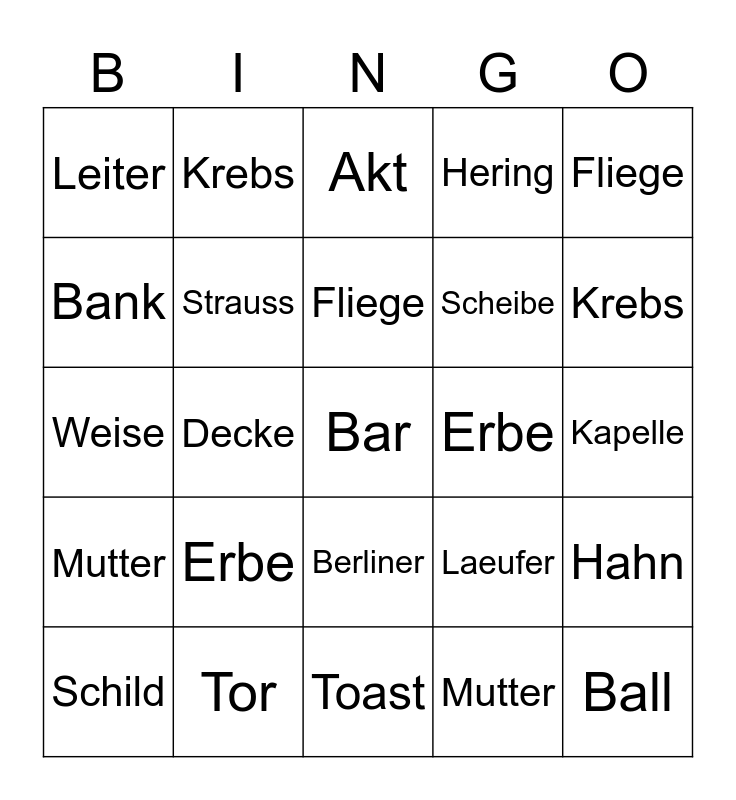 This bingo card has a free space and 24 words: Erbe, Tor, Fliege, Schild, Fliege, Leiter, Bank, Krebs, Erbe, Berliner, Scheibe, Weise, Laeufer, Hahn, Strauss, Mutter, Kapelle, Akt, Krebs, Decke, Ball, Mutter, Hering and Toast.