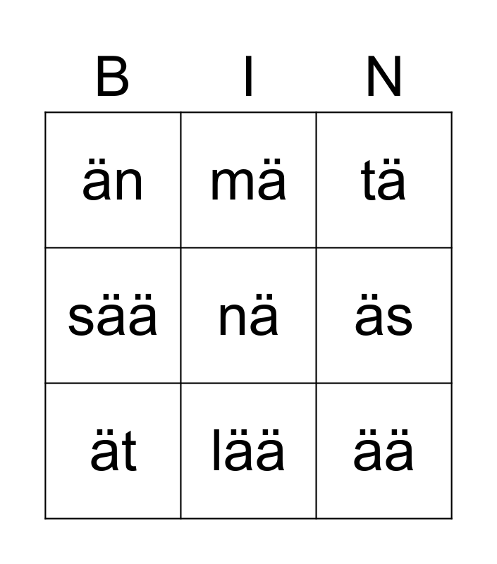 This bingo card has 9 words: ät, tä, mä, sää, än, äs, nä, ää and lää.