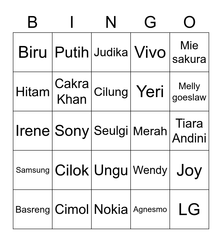 This bingo card has a free space and 24 words: Cilok, Cimol, Cilung, Basreng, Mie sakura, Biru, Hitam, Putih, Merah, Ungu, Yeri, Irene, Wendy, Joy, Cakra Khan, Agnesmo, Tiara Andini, Judika, Melly goeslaw, Sony, LG, Samsung, Vivo and Nokia.