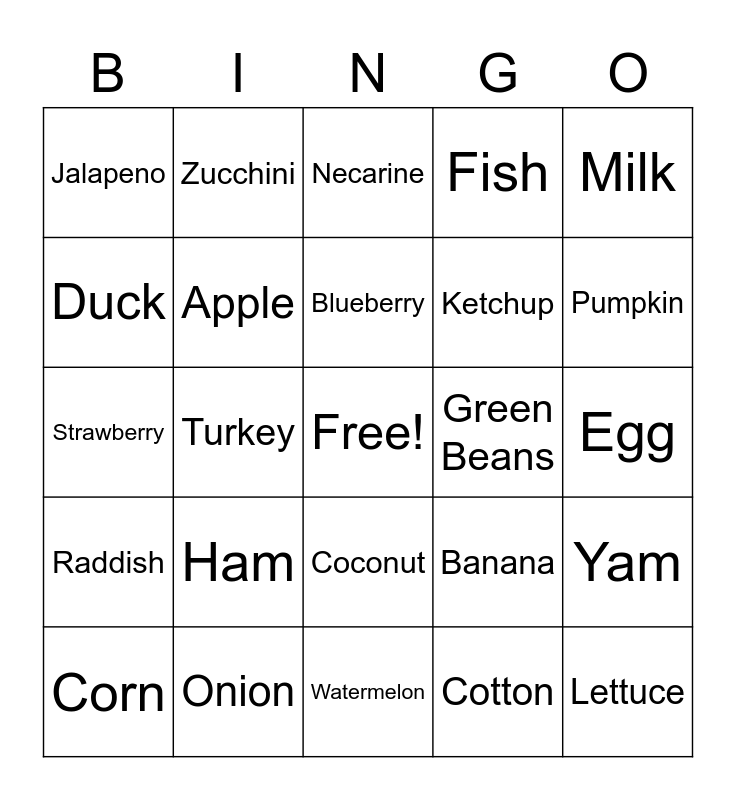 This bingo card has a free space and 24 words: Ham, Onion, Blueberry, Corn, Milk, Jalapeno, Duck, Zucchini, Green Beans, Coconut, Ketchup, Strawberry, Banana, Yam, Apple, Cotton, Egg, Necarine, Pumpkin, Turkey, Lettuce, Raddish, Fish and Watermelon.