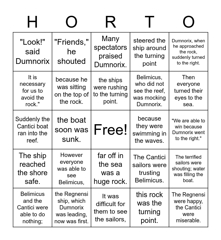 This bingo card has a free space and 26 words: far off in the sea was a huge rock., this rock was the turning point., the ships were rushing to the turning point., the Regnensi ship, which Dumnorix was leading, now was first., Dumnorix, when he approached the rock, suddenly turned to the right., "Look!" said Dumnorix, It is necessary for us to avoid the rock.", "Friends," he shouted, "We are able to win because Dumnorix went to the right.", The Cantici sailors were trusting Belimicus., Belimicus, who did not see the reef, was mocking Dumnorix., Suddenly the Cantici boat ran into the reef., The terrified sailors were shouting; water was filling the boat., Belimicus and the Cantici were able to do nothing;, the boat soon was sunk., Meanwhile Dumnorix, who was sailing with the greatest care,, steered the ship around the turning point, The ship reached the shore safe., Many spectators praised Dumnorix., The Regnensi were happy, the Cantici were miserable., Then everyone turned their eyes to the sea., It was difficult for them to see the sailors,, because they were swimming in the waves., However everyone was able to see Belimicus,, because he was sitting on the top of the rock. and Soaked through, he was hanging to the rock and was demanding help..