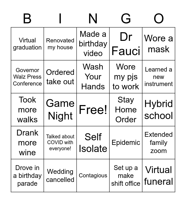 This bingo card has a free space and 61 words: Stuck at home, Wedding cancelled, Cut my own hair, Drank more wine, Set up a make shift office, Got a new desk, Ordered take out, Played virtual trivia, Wore my pjs to work, Homeschooled my kids, Dr Fauci, CDC, Governor Walz Press Conference, Prom cancelled, Self quarantined, Virtual graduation, Virtual funeral, Wore a mask, Made my own mask, Wash Your Hands, Stay Home Order, Made a birthday video, Drove in a birthday parade, Extended family zoom, Locked my kids out of the house, Absentee ballot, Social distanced, Online grocery order, Learned a new instrument, Watched a new show, Listened to a podcast, Started a blog, Got a new pet, Got a new chair, Renovated my house, COVID testing, Vaccine, Game Night, Ordered from Amazon, Took more walks, Cleaned closets, Talked about COVID with everyone!, Hybrid school, Pandemic, Epidemic, Outbreak, Contact Tracing, Community Spread, Super spreader, Self Isolate, Contagious, Virus, Droplets, Transmission, Asymptomatic, Flattening the curve, Drive thru testing, Self Monitor, Shelter in Place, PPE and N95.