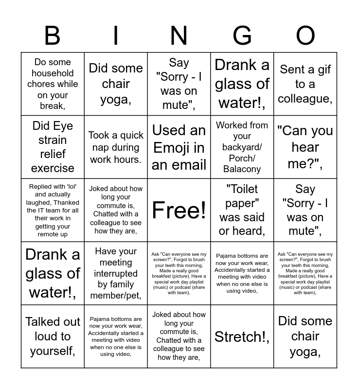 This bingo card has a free space and 44 words: "Can you hear me?",, Did some chair yoga,, Joked about never working in the office again,, Talked out loud to yourself,, Do some household chores while on your break,, Stretch!,, Say "Sorry - I was on mute",, Share a meme about working from home with a colleague,, Sent a gif to a colleague,, Pajama bottoms are now your work wear, Accidentally started a meeting with video when no one else is using video,, Drank a glass of water!,, "Toilet paper" was said or heard,, Ask "Can everyone see my screen?", Forgot to brush your teeth this morning, Made a really good breakfast (picture), Have a special work day playlist (music) or podcast (share with team),, Have your meeting interrupted by family member/pet,, Made a really good lunch (picture),, Joked about how long your commute is, Chatted with a colleague to see how they are,, "NO Toilet paper" was said or heard,, Replied with 'lol' and actually laughed, Thanked the IT team for all their work in getting your remote up, Give a coworker a shout out in huddle., "Can you hear me?",, Did some chair yoga,, Joked about never working in the office again,, Talked out loud to yourself,, Do some household chores while on your break,, Stretch!,, Say "Sorry - I was on mute",, Share a meme about working from home with a colleague,, Sent a gif to a colleague,, Pajama bottoms are now your work wear, Accidentally started a meeting with video when no one else is using video,, Drank a glass of water!,, "Toilet paper" was said or heard,, Ask "Can everyone see my screen?", Forgot to brush your teeth this morning, Made a really good breakfast (picture), Have a special work day playlist (music) or podcast (share with team),, Have your meeting interrupted by family member/pet,, Made a really good lunch (picture),, Joked about how long your commute is, Chatted with a colleague to see how they are,, "Toilet paper" was said or heard,, Replied with 'lol' and actually laughed, Thanked the IT team for all their work in getting your remote up, Give a coworker a shout out in huddle., Used an Emoji in an email, Did Eye strain relief exercise, Worked from your backyard/ Porch/ Balacony, Took a typing speed test … for fun, Took a quick nap during work hours. and Watched Netflix while working..