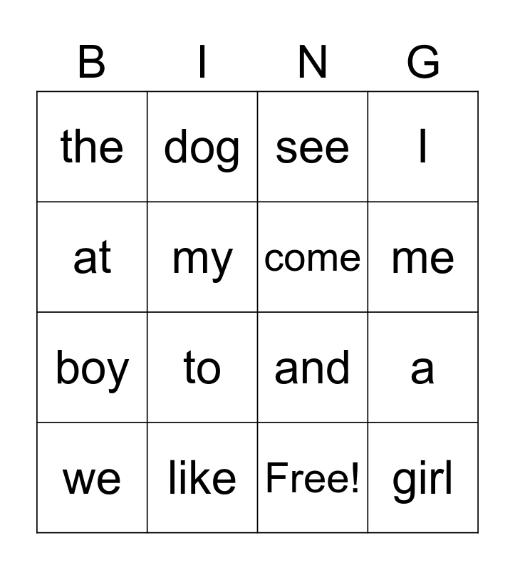 This bingo card has 17 words: Free!, we, see, the, to, I, a, come, me, my, like, and, at, dog, boy, cat and girl.
