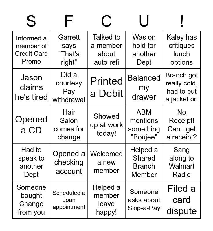 This bingo card has a free space and 24 words: Opened a checking account, Scheduled a Loan appointment, Printed a Debit, Someone bought Change from you, Kaley has critiques lunch options, Informed a member of Credit Card Promo, Jason claims he's tired, Garrett says "That's right", ABM mentions something "Boujee", Welcomed a new member, Balanced my drawer, Opened a CD, Helped a Shared Branch Member, Sang along to Walmart Radio, Did a courtesy Pay withdrawal, Someone asks about Skip-a-Pay, No Receipt! Can I get a receipt?, Talked to a member about auto refi, Branch got really cold, had to put a jacket on, Hair Salon comes for change, Filed a card dispute, Had to speak to another Dept, Was on hold for another Dept and Helped a member leave happy!.