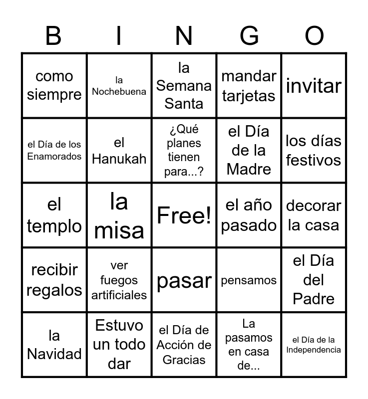 This bingo card has a free space and 33 words: reunirse con toda la familia, la sinagoga, la misa, ¿Qué tal estuvo?, recibir regalos, el Hanukah, invitar, la Navidad, la Nochebuena, la Nochevieja, ¿Qué planes tienen para...?, la Semana Santa, hacer un picnic, abrir regalos, el año pasado, los días festivos, Estuvo un todo dar, el templo, ver fuegos artificiales, pensamos, pasar, el Año Nuevo, como siempre, decorar la casa, el Día de Acción de Gracias, el Día de la Independencia, mandar tarjetas, el Día de la Madre, el Día de los Enamorados, el Día del Padre, hacer una fiesta, La pasamos en casa de... and celebrar/festejar.