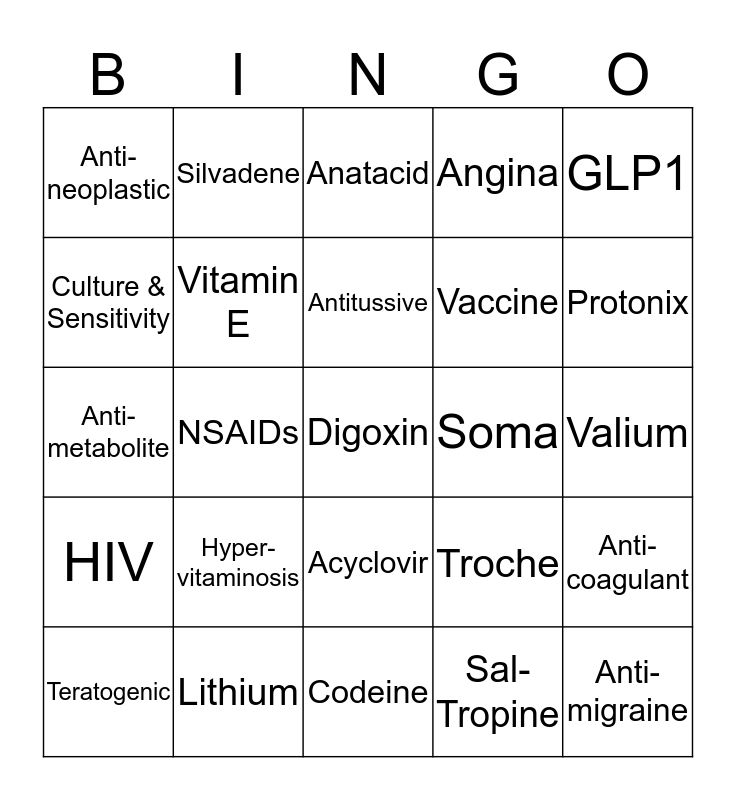 This bingo card has 25 words: Hyper-vitaminosis, Codeine, Antitussive, Teratogenic, GLP1, Anti-neoplastic, Culture & Sensitivity, Silvadene, Soma, Acyclovir, Vaccine, Anti-metabolite, Troche, Anti-coagulant, Vitamin E, Anti-migraine, Valium, Anatacid, Protonix, NSAIDs, Digoxin, Lithium, HIV, Angina and Sal-Tropine.
