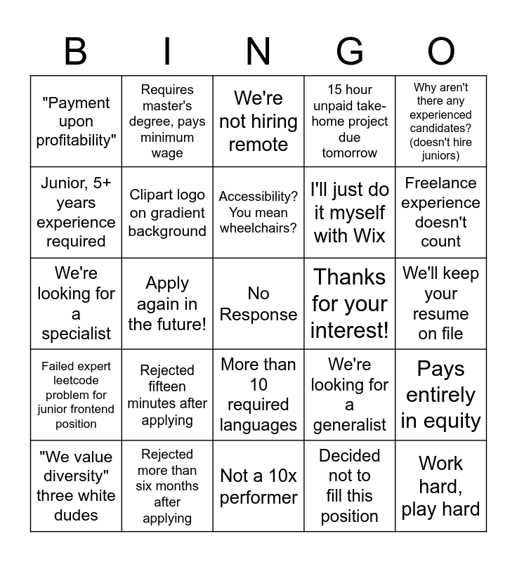 This bingo card has a free space and 24 words: Rejected fifteen minutes after applying, Rejected more than six months after applying, Accessibility? You mean wheelchairs?, "We value diversity" three white dudes, Why aren't there any experienced candidates? (doesn't hire juniors), "Payment upon profitability", Junior, 5+ years experience required, Requires master's degree, pays minimum wage, Thanks for your interest!, More than 10 required languages, I'll just do it myself with Wix, We're looking for a specialist, We're looking for a generalist, Pays entirely in equity, Clipart logo on gradient background, Decided not to fill this position, We'll keep your resume on file, We're not hiring remote, Freelance experience doesn't count, Apply again in the future!, Work hard, play hard, Failed expert leetcode problem for junior frontend position, 15 hour unpaid take-home project due tomorrow and Not a 10x performer.
