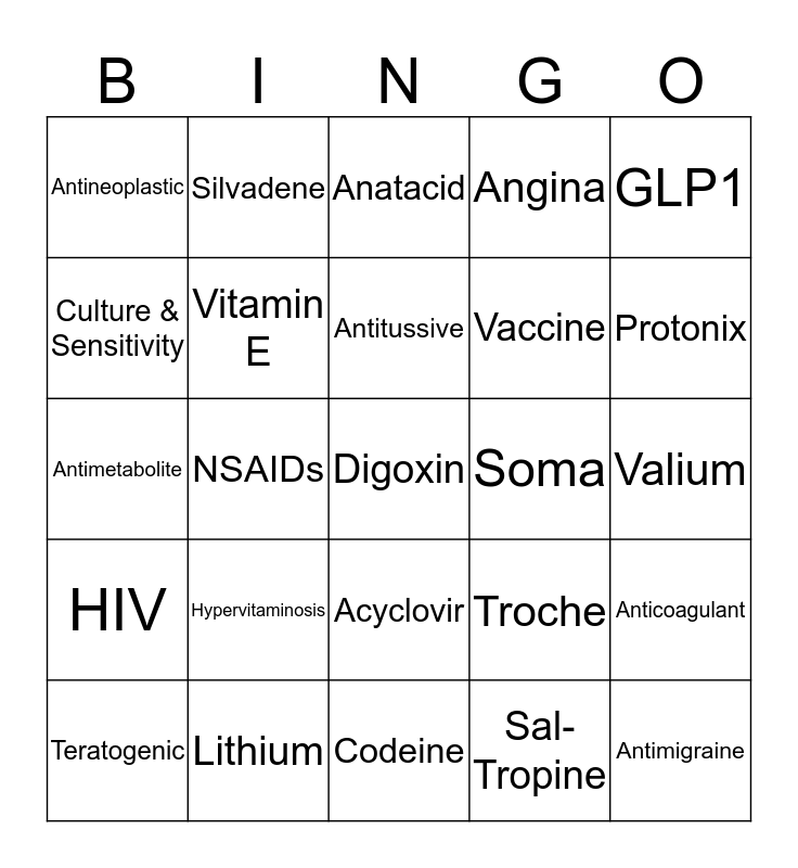 This bingo card has 25 words: Hypervitaminosis, Codeine, Antitussive, Teratogenic, GLP1, Antineoplastic, Culture & Sensitivity, Silvadene, Soma, Acyclovir, Vaccine, Antimetabolite, Troche, Anticoagulant, Vitamin E, Antimigraine, Valium, Anatacid, Protonix, NSAIDs, Digoxin, Lithium, HIV, Angina and Sal-Tropine.
