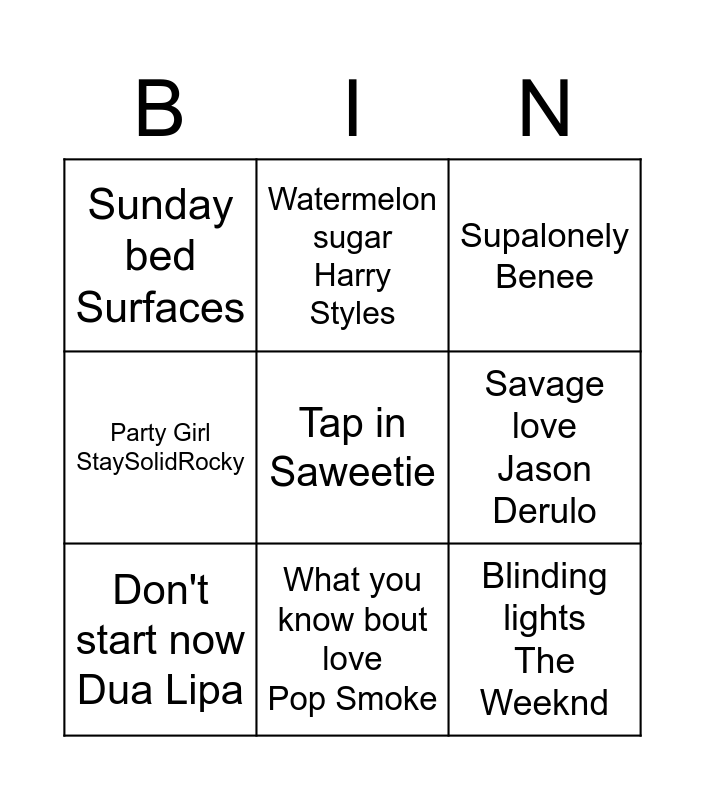 This bingo card has 19 words: Say So Doja Cat, Lottery K Camp, Supalonely Benee, Bad Boy YungBae, My heart went oops Tiagz, Tap in Saweetie, Death bed Powfu, Sunday bed Surfaces, Watermelon sugar Harry Styles, Blinding lights The Weeknd, Banana DJ Fle, Savage love Jason Derulo, Don't start now Dua Lipa, Mamacita Black Eyed Peas, Make you mine Public, Freak Doja Cat, Party Girl StaySolidRocky, What you know bout love Pop Smoke and Oh no Capone.