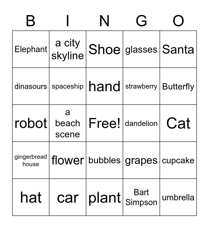 This bingo card has a free space and 24 words: flower, car, hand, hat, Santa, Elephant, dinasours, a city skyline, dandelion, bubbles, strawberry, robot, grapes, cupcake, spaceship, Bart Simpson, Cat, Shoe, Butterfly, a beach scene, umbrella, gingerbread house, glasses and plant.