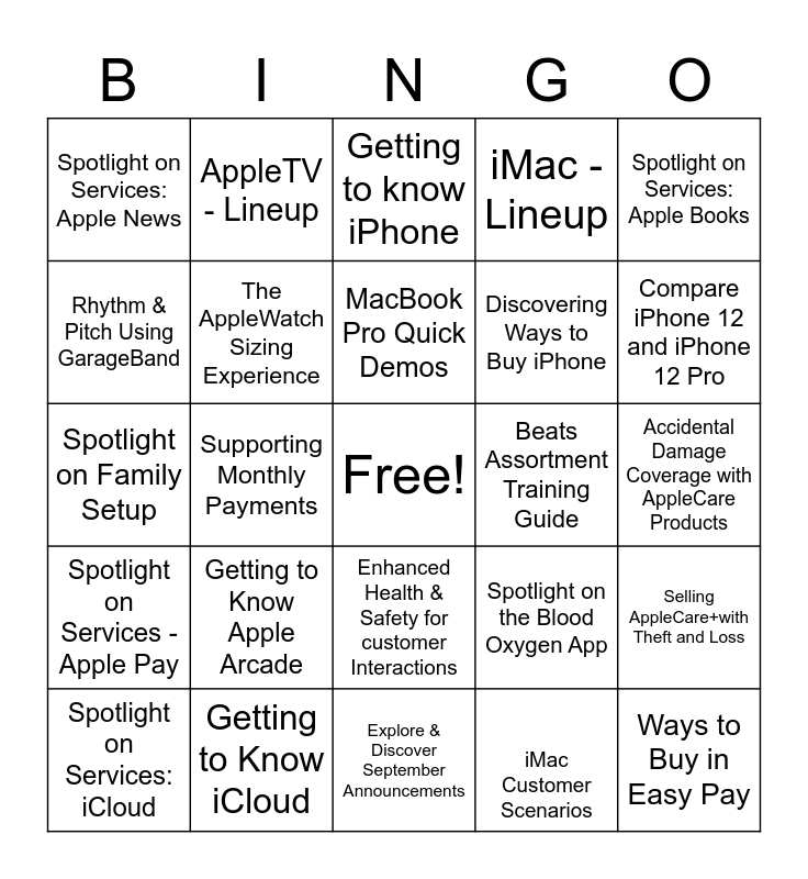 This bingo card has a free space and 24 words: Getting to Know Apple Arcade, Getting to Know iCloud, MacBook Pro Quick Demos, Spotlight on Services: iCloud, Spotlight on Services: Apple Books, Spotlight on Services: Apple News, Rhythm & Pitch Using GarageBand, AppleTV - Lineup, Beats Assortment Training Guide, Enhanced Health & Safety for customer Interactions, Discovering Ways to Buy iPhone, Spotlight on Family Setup, Spotlight on the Blood Oxygen App, Selling AppleCare+with Theft and Loss, The AppleWatch Sizing Experience, iMac Customer Scenarios, Accidental Damage Coverage with AppleCare Products, Getting to know iPhone, Compare iPhone 12 and iPhone 12 Pro, Supporting Monthly Payments, Ways to Buy in Easy Pay, Spotlight on Services - Apple Pay, iMac - Lineup and Explore & Discover September Announcements.