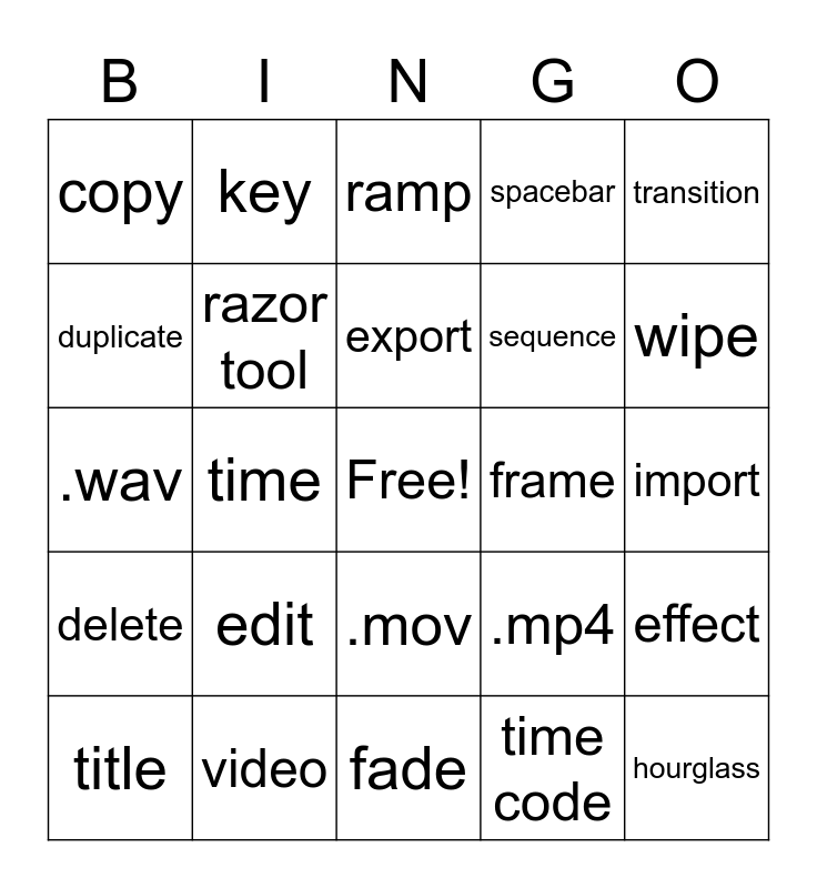 This bingo card has a free space and 24 words: edit, video, export, title, transition, copy, duplicate, key, frame, .mov, sequence, .wav, .mp4, effect, razor tool, time code, import, ramp, wipe, time, hourglass, delete, spacebar and fade.