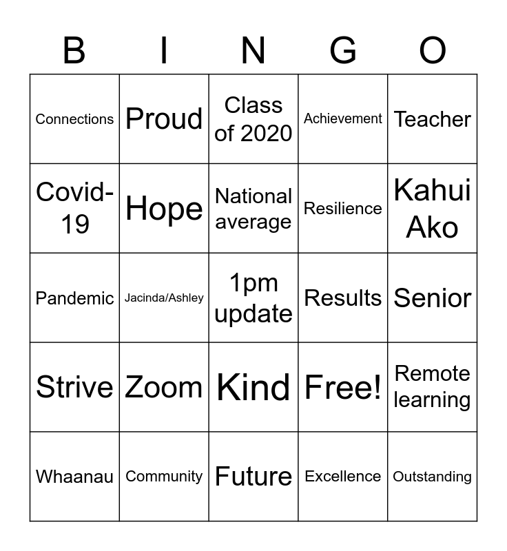 This bingo card has 27 words: Free!, Outstanding, Resilience, Future, Covid-19, Class of 2020, Proud, Strive, Results, Remote learning, Pandemic, Achievement, Whaanau, Community, Kahui Ako, Maungakiekie, Hope, National average, Zoom, Connections, Senior, Excellence, Jacinda/Ashley, 1pm update, Kind, Teacher and Student.
