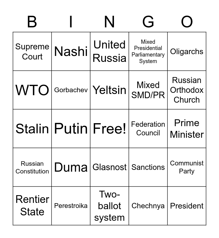 This bingo card has a free space and 41 words: Russian Revolution, Stalin, Politburo, Gorbachev, Perestroika, Glasnost, Yeltsin, Shock Therapy, Oligarchs, Russian Constitution, Putin, Mixed Presidential Parliamentary System, President, Prime Minister, Federation Council, Duma, Constitutional Court, Supreme Court, Asymmetric Federalism, United Russia, Communist Party, Liberal Democratic Party, Two-ballot system, Mixed SMD/PR, Proportional Representation, Winter Protests 2011-2012, Chechnya, Beslan School Massacre, Russian Orthodox Church, Muslims, State corporatism, Nashi, Rentier State, Gazprom, Sanctions, WTO, CIS, Crimea, State Media, Political Socialization and LGBT Russians.