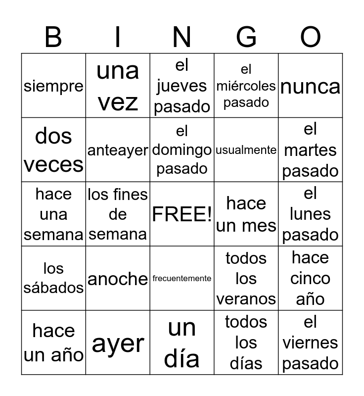 This bingo card has a free space and 24 words: anoche, ayer, el domingo pasado, hace un año, nunca, siempre, dos veces, una vez, hace un mes, frecuentemente, usualmente, hace una semana, todos los veranos, hace cinco año, anteayer, todos los días, el lunes pasado, el jueves pasado, el martes pasado, los fines de semana, el viernes pasado, los sábados, el miércoles pasado and un día.