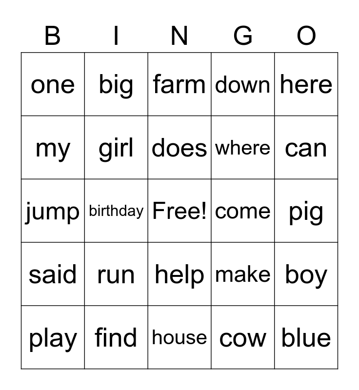 This bingo card has a free space and 24 words: run, find, does, play, here, one, my, big, come, help, where, jump, make, boy, girl, cow, pig, farm, can, birthday, blue, said, down and house.