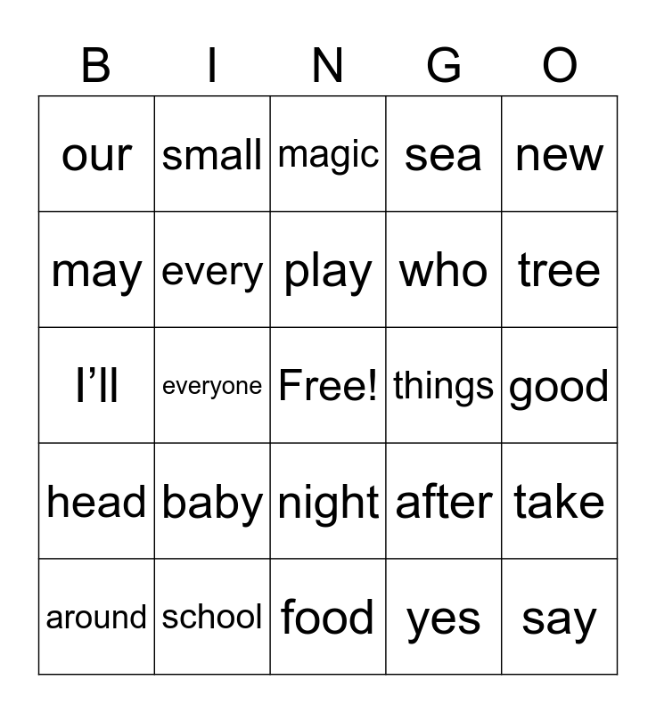 This bingo card has a free space and 100 words: water, away, good, want, over, how, did, man, going, where, would, or, took, school, think, home, who, didn’t, ran, know, bear, can’t, again, cat, long, things, new, after, wanted, eat, everyone, our, two, has, yes, play, take, thought, dog, well, find, more, I’ll, round, tree, magic, shouted, us, other, food, fox, through, way, been, stop, must, red, door, right, sea, these, began, boy, animals, never, next, first, work, lots, need, that’s, baby, fish, gave, mouse, something, bed, may, still, found, live, say, soon, night, narrator, small, car, couldn’t, three, head, king, town, I’ve, around, every, garden, fast, only, many and laughed.