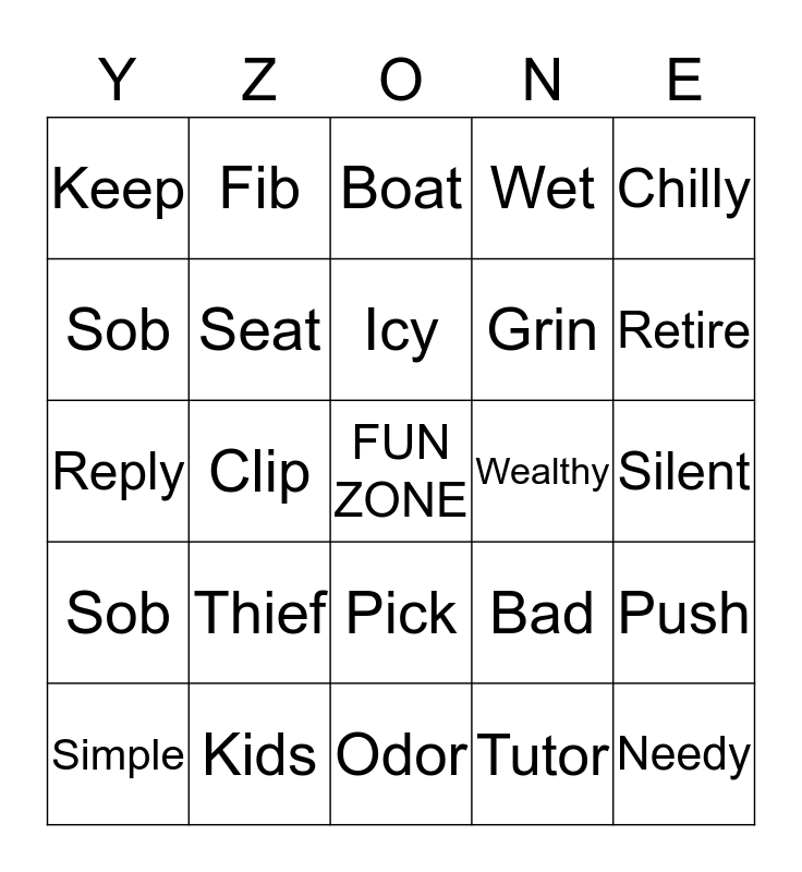 This bingo card has a free space and 41 words: Every, Reply, Start, Seat, Kids, Pick, Icy, Arrive, Chilly, Sob, Clip, Wet, Needy, Silent, Wealthy, Thief, Unhappy, Keep, Greedy, Boat, Push, Snooze, Odor, Grin, Tune, Cab, Tutor, Decide, Retire, Retain, Fewer, Fib, Simple, Consume, Bad, Sob, Purchase, Soaked, Compose, Shout and Fuse.