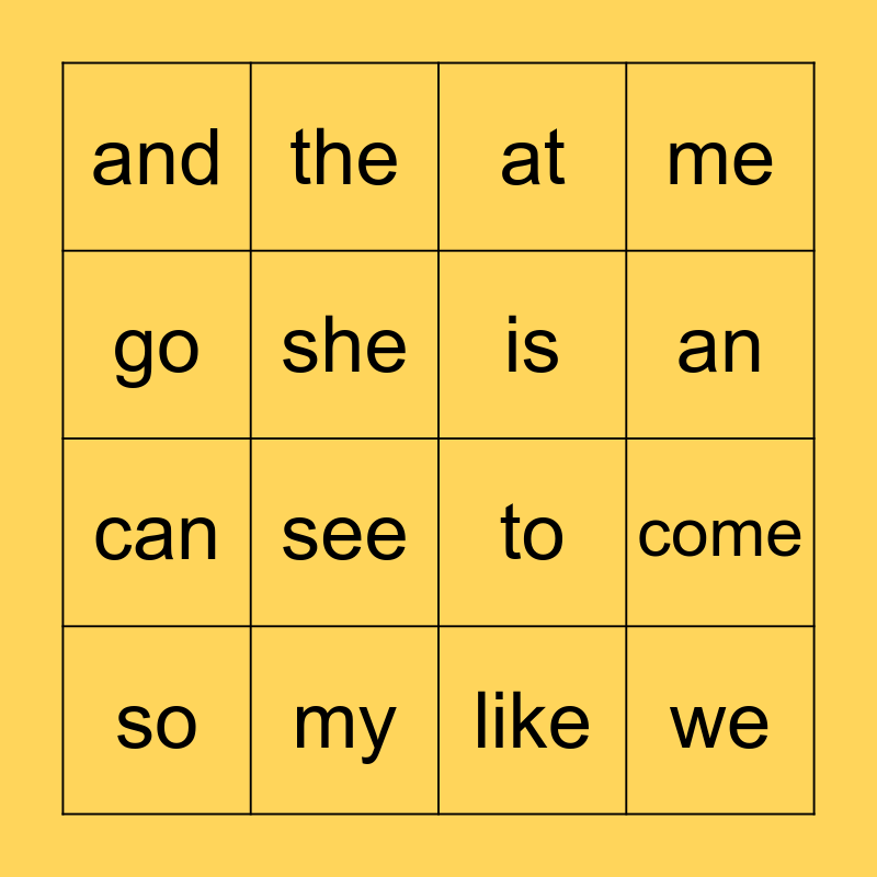 This bingo card has 21 words: my, a, the, I, like, is, and, at, to, an, can, me, we, he, she, am, so, see, go, come and you.