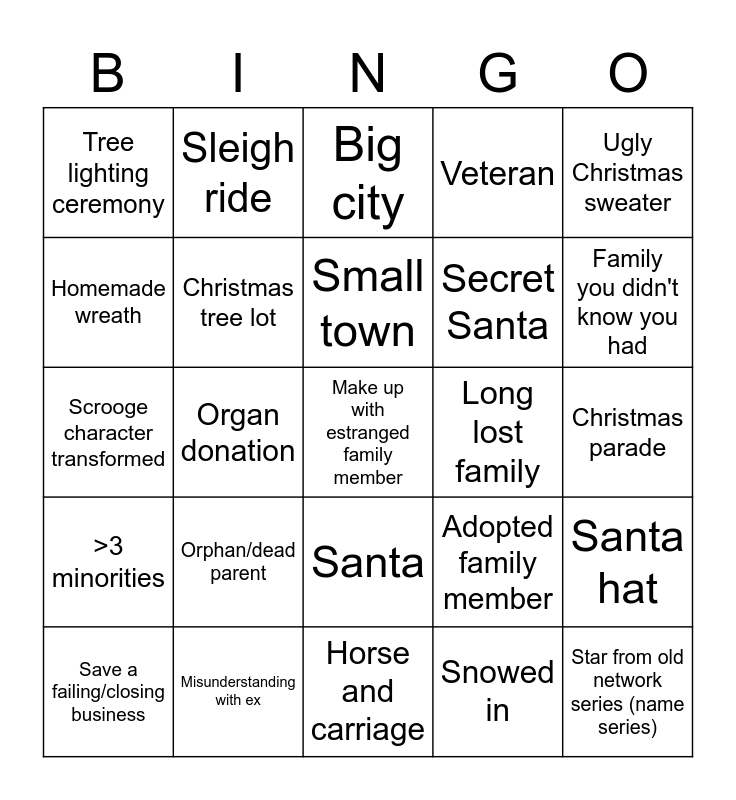 This bingo card has 34 words: Star from old network series (name series), Snowed in, Stuck at airport/closed airport, Barn dance, >3 minorities, Christmas tree lot, Ugly Christmas sweater, Save a failing/closing business, Sleigh ride, Blizzard, Small town, Big city, Ice skating, Skiing, Long lost family, Family you didn't know you had, Misunderstanding with ex, Scrooge character transformed, Orphan/dead parent, Adopted family member, Santa, brass band, Tree lighting ceremony, Christmas parade, Horse and carriage, Make up with estranged family member, Veteran, Rare disease/health crisis, Secret Santa, Homemade wreath, Blind date, Organ donation, Santa hat and Gingerbread house.