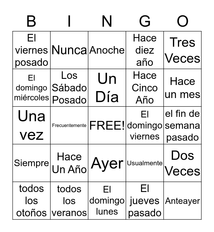 This bingo card has a free space and 24 words: Hace Un Año, todos los veranos, Un Día, todos los otoños, Tres Veces, El viernes posado, El domingo miércoles, Nunca, El domingo viernes, Ayer, Hace Cinco Año, Una vez, Usualmente, Dos Veces, Los Sábado Posado, El jueves pasado, el fin de semana pasado, Anoche, Hace un mes, Frecuentemente, Anteayer, Siempre, Hace diez año and El domingo lunes.