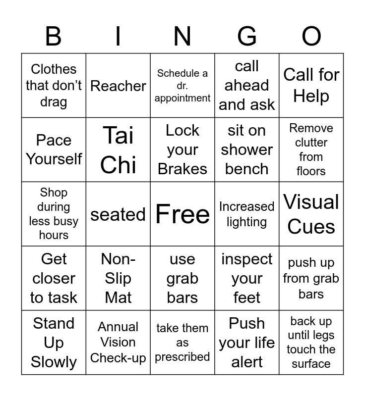 This bingo card has a free space and 24 words: Non-Slip Mat, Annual Vision Check-up, Lock your Brakes, Stand Up Slowly, Call for Help, Clothes that don’t drag, Pace Yourself, Reacher, Increased lighting, use grab bars, sit on shower bench, Shop during less busy hours, inspect your feet, push up from grab bars, Tai Chi, Push your life alert, Visual Cues, Schedule a dr. appointment, Remove clutter from floors, seated, back up until legs touch the surface, Get closer to task, call ahead and ask and take them as prescribed.