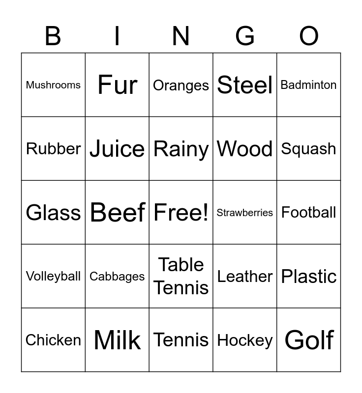 This bingo card has a free space and 29 words: Chicken, Pork, Beef, Potatoes, Mushrooms, Oranges, Juice, Cabbages, Strawberries, Milk, Football, Golf, Tennis, Hockey, Squash, Basketball, Table Tennis, Volleyball, Badminton, Glass, Leather, Cotton, Wood, Rubber, Steel, Fur, Plastic, Rainy and Snowy.