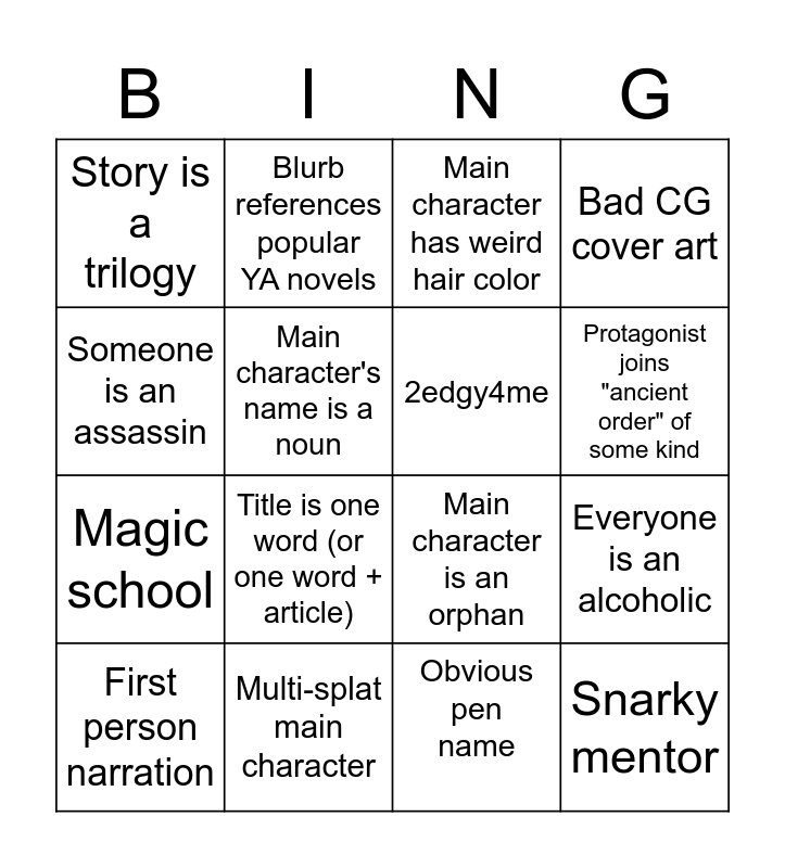 This bingo card has 16 words: Multi-splat main character, Everyone is an alcoholic, Main character has weird hair color, Story is a trilogy, Magic school, Blurb references popular YA novels, Main character is an orphan, Obvious pen name, Someone is an assassin, Main character's name is a noun, First person narration, Bad CG cover art, Title is one word (or one word + article), Protagonist joins "ancient order" of some kind, 2edgy4me and Snarky mentor.