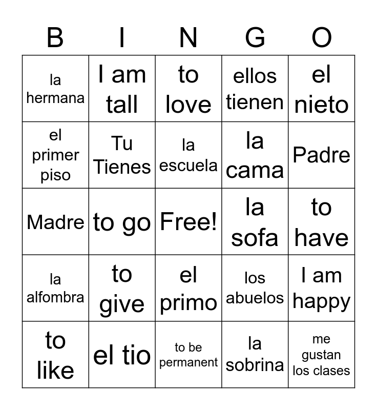 This bingo card has a free space and 29 words: to like, Yo Tengo, to go, el dormitorio, la hermana, to love, Tu Tienes, to give, la sofa, el tio, to have, me gustan los clases, to be permanent, la sobrina, Padre, me encantael cine, el primo, la alfombra, el nieto, Madre, los abuelos, la tia, la cama, el primer piso, ellos tienen, I am tall, I am happy, la escuela and el jardin.