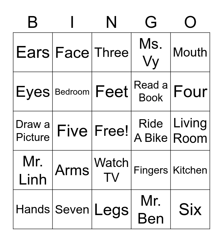 This bingo card has a free space and 25 words: Arms, Legs, Feet, Hands, Mouth, Ears, Eyes, Face, Ride A Bike, Watch TV, Read a Book, Draw a Picture, Fingers, Kitchen, Bedroom, Bathroom, Living Room, Three, Four, Five, Six, Seven, Mr. Linh, Ms. Vy and Mr. Ben.