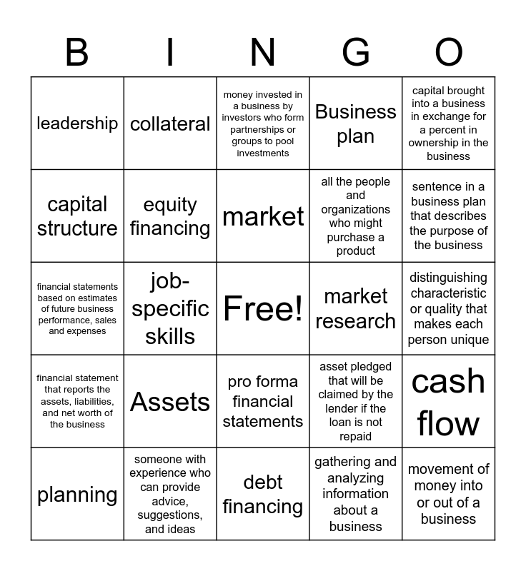 This bingo card has a free space and 49 words: Angel Investors, movement of money into or out of a business, written statement of goals and objectives for a business with a stategy to achieve them, debt financing, Assets, borrowing money that must be repaid for use in the business, collateral, private investors who fund star up business, capital structure, refers to the way a business if financed, equity financing, Business plan, cash flow, asset pledged that will be claimed by the lender if the loan is not repaid, property or items of value a business owns, ability to influence others to reach a goal, market, market research, mentor, capital brought into a business in exchange for a percent in ownership in the business, job-specific skills, gathering and analyzing information about a business, leadership, all the people and organizations who might purchase a product, critical skills necessary to preform the required work related tasks of a position, sentence in a business plan that describes the purpose of the business, planning, pro forma balance sheet, pro forma financial statements, financial statement that reports the assets, liabilities, and net worth of the business, process of setting goals and planning how to accomplish them, financial statement that reports anticipated sources and uses of cash from operations, investing, and financing activities, mission statement, pro forma cash flow statement, someone with experience who can provide advice, suggestions, and ideas, financial statement that projects revenues and expenses to show whether or not a business is profitable, venture capital, transferable skills, distinguishing characteristic or quality that makes each person unique, start-up capital, pre forma income statement, trait, skills gained from life experience or working on a job that helps and individual preform in the workplace or gain success in a career; also known as foundation skills, money necessary to start and open and business; also called seed capital, financial statements based on estimates of future business performance, sales and expenses, money invested in a business by investors who form partnerships or groups to pool investments, entrepreneur, a person who organizes and operates a business or businesses, taking on greater than normal financial risks in order to do so and FREE.