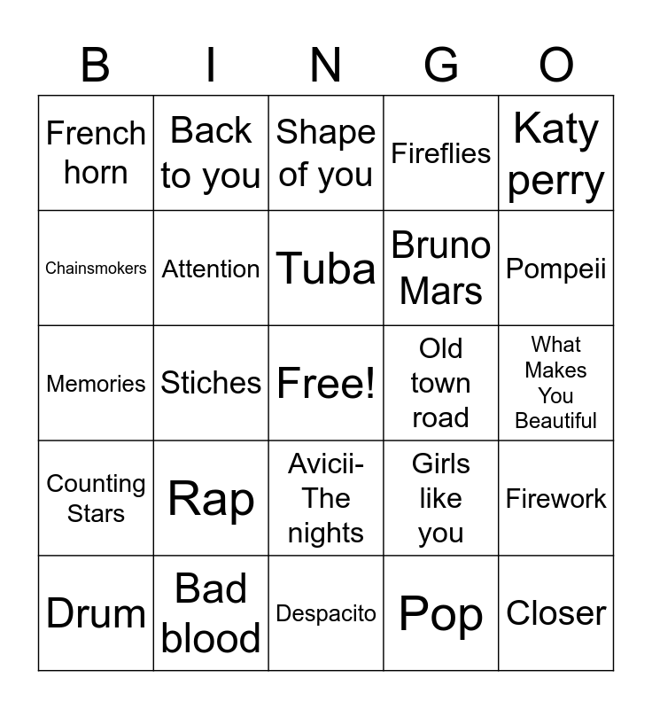 This bingo card has a free space and 24 words: Rap, Bad blood, Tuba, Drum, Katy perry, French horn, Chainsmokers, Back to you, Old town road, Avicii- The nights, Bruno Mars, Memories, Girls like you, Firework, Attention, Pop, What Makes You Beautiful, Shape of you, Pompeii, Stiches, Closer, Counting Stars, Fireflies and Despacito.