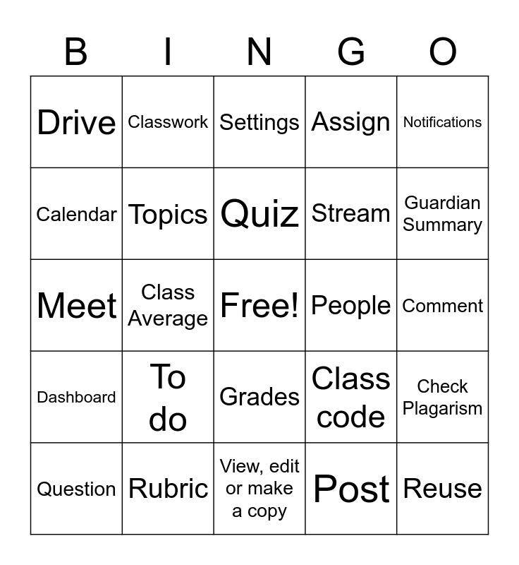 This bingo card has a free space and 24 words: To do, Rubric, Quiz, Question, Notifications, Drive, Calendar, Classwork, People, Grades, Stream, Meet, Class code, Check Plagarism, Topics, Post, Comment, Settings, Guardian Summary, Class Average, Reuse, Dashboard, Assign and View, edit or make a copy.