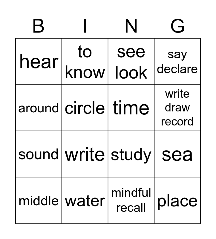 This bingo card has 16 words: water, sea, see look, hear, sound, to know, study, mindful recall, around, circle, middle, say declare, write, write draw record, time and place.