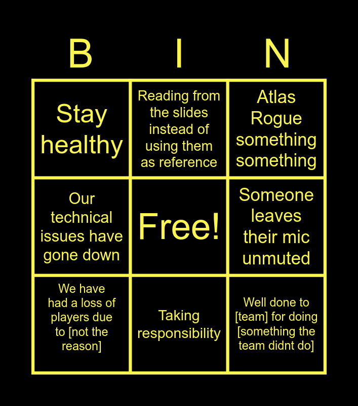 This bingo card has a free space and 13 words: We are not making enough money, Our sales have been good, We have had a loss of players due to [not the reason], Reading from the slides instead of using them as reference, Our technical issues have gone down, Well done to [team] for doing [something the team didnt do], People need to communicate better, Something about Covid, Taking responsibility, Stay healthy, Someone leaves their mic unmuted, Atlas Rogue something something and We've acquired another company.