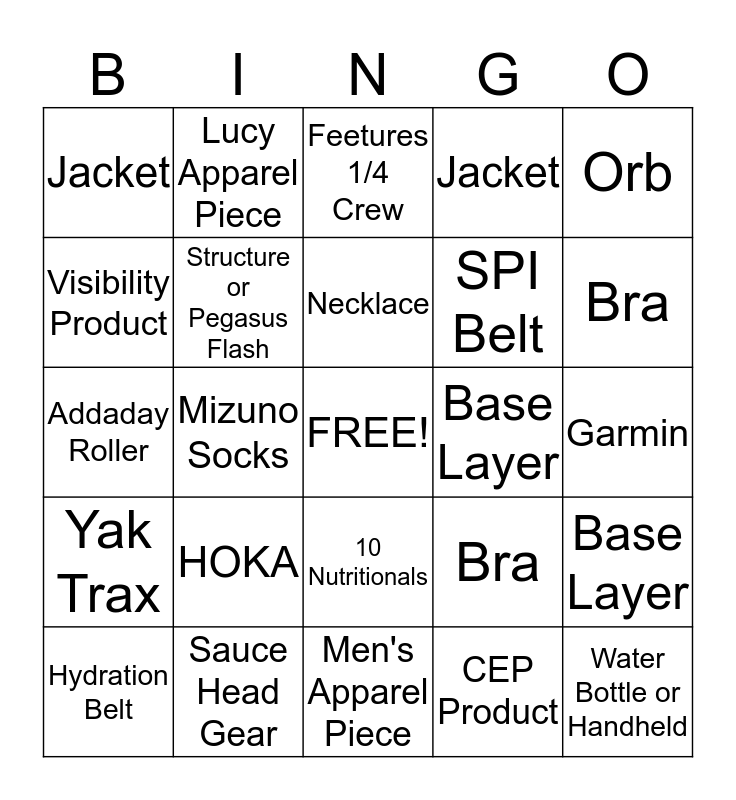 This bingo card has a free space and 24 words: HOKA, Sauce Head Gear, Necklace, Hydration Belt, Orb, Jacket, Visibility Product, Lucy Apparel Piece, Base Layer, 10 Nutritionals, SPI Belt, Addaday Roller, Bra, Base Layer, Structure or Pegasus Flash, CEP Product, Garmin, Feetures 1/4 Crew, Bra, Mizuno Socks, Water Bottle or Handheld, Yak Trax, Jacket and Men's Apparel Piece.