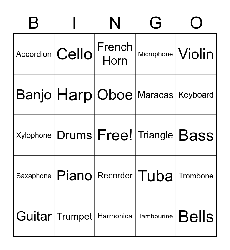 This bingo card has a free space and 24 words: Piano, Trumpet, Oboe, Guitar, Violin, Accordion, Banjo, Cello, Triangle, Recorder, Maracas, Xylophone, Tuba, Trombone, Harp, Tambourine, Bass, French Horn, Keyboard, Drums, Bells, Saxaphone, Microphone and Harmonica.