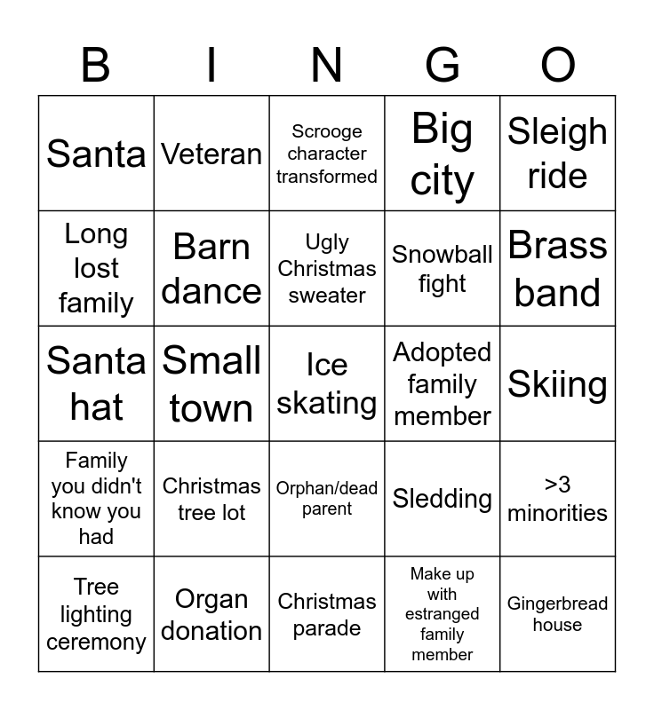 This bingo card has 37 words: Star from old network series (name series), Snowed in, Stuck at airport/closed airport, Barn dance, >3 minorities, Christmas tree lot, Ugly Christmas sweater, Save a failing/closing business, Sleigh ride, Blizzard, Small town, Big city, Ice skating, Skiing, Long lost family, Family you didn't know you had, Misunderstanding with ex, Scrooge character transformed, Orphan/dead parent, Adopted family member, Santa, Brass band, Tree lighting ceremony, Christmas parade, Horse and carriage, Make up with estranged family member, Veteran, Rare disease/health crisis, Secret Santa, Homemade wreath, Blind date, Organ donation, Santa hat, Gingerbread house, Sledding, Snowball fight and Snowman.