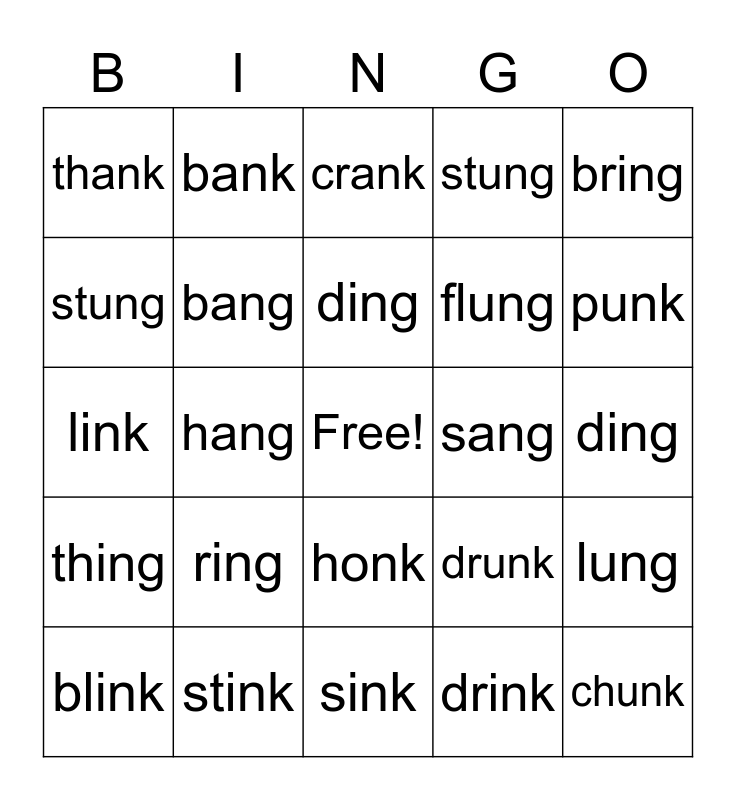 This bingo card has a free space and 24 words: ring, stink, ding, blink, bring, thank, stung, bank, sang, honk, flung, link, drunk, lung, bang, drink, ding, crank, punk, hang, chunk, thing, stung and sink.
