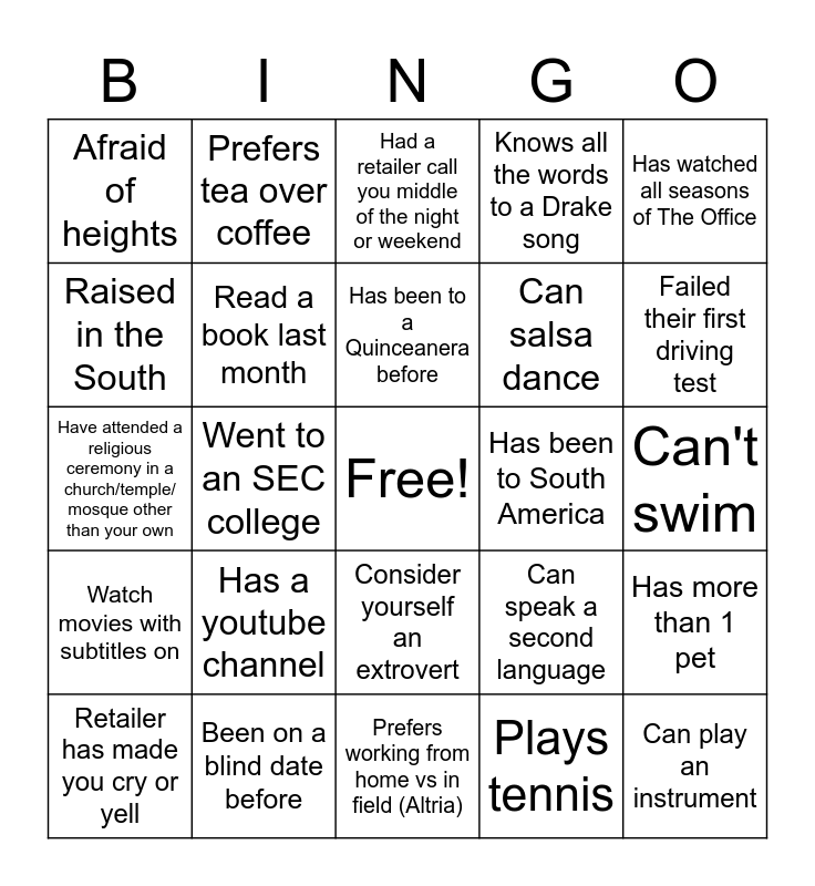 This bingo card has a free space and 49 words: Learned a new skill during quarantine, Can play an instrument, Enjoys country music, Prefers working from home vs in field (Altria), Has a youtube channel, Woke up before 6am today, Prefers tea over coffee, Has visited at least 3 museums, Raised in the South, Finished Game of Thrones, Read a book last month, Knows all the words to a Drake song, Has more than 1 pet, Can speak a second language, can code HTML, Is the oldest child, Has been to a Quinceanera before, Has been to South America, Allergic to cats, Has watched all seasons of The Office, Went to an SEC college, Plays tennis, Afraid of heights, Can salsa dance, Has never broken a bone, Failed their first driving test, Retailer has made you cry or yell, Green is your favorite color, Consider yourself an extrovert, Watch movies with subtitles on, Have eaten at a Thai restaurant, Ran a marathon, Made a NYE resolution and kept it, Have a side business, Been on a blind date before, Have eaten food with your hands as the culture dictates, Exercise 3+ times a week, Has more than one race or culture in your family, Can't swim, Own a plant, Actually like spinach, Still know your high school fight/theme song, Made a tik-tok, Signed a store to scan data this month, Have attended a religious ceremony in a church/temple/ mosque other than your own, Had a retailer call you middle of the night or weekend, Have a friend with a major disability, Know sign language and Have family that has farmland.