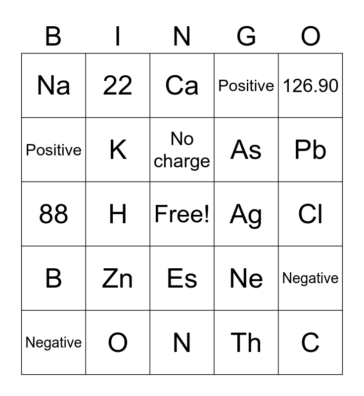 This bingo card has a free space and 30 words: O, U, H, S, Na, Ca, K, Es, Ag, N, Cl, C, Th, He, Pb, Hg, Ne, B, Zn, 126.90, 88, Au, 22, As, Positive, Positive, Negative, Negative, No charge and 18.