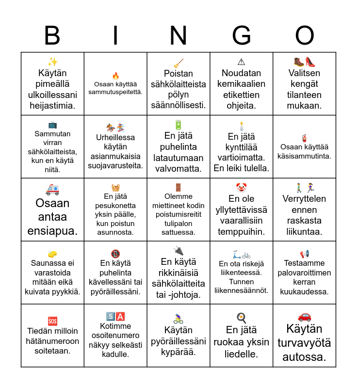 This bingo card has 25 words: 📵 En käytä puhelinta kävellessäni tai pyöräillessäni., 🚴♀️ Käytän pyöräillessäni kypärää., 🔋 En jätä puhelinta latautumaan valvomatta., 🆘 Tiedän milloin hätänumeroon soitetaan., 🥾👠 Valitsen kengät tilanteen mukaan., ✨ Käytän pimeällä ulkoillessani heijastimia., 📺 Sammutan virran sähkölaitteista, kun en käytä niitä., 🔥 Osaan käyttää sammutuspeitettä., 🤡 En ole yllytettävissä vaarallisiin temppuihin., 🔌 En käytä rikkinäisiä sähkölaitteita tai -johtoja., 🕯 En jätä kynttilää vartioimatta. En leiki tulella., 🚑 Osaan antaa ensiapua., 🛴🚲 En ota riskejä liikenteessä. Tunnen liikennesäännöt., 📢 Testaamme palovaroittimen kerran kuukaudessa., 🏇🏂 Urheillessa käytän asianmukaisia suojavarusteita., 🚗 Käytän turvavyötä autossa., 🚶♂️🏃♀️ Verryttelen ennen raskasta liikuntaa., 🧹 Poistan sähkölaitteista pölyn säännöllisesti., 🧯 Osaan käyttää käsisammutinta., 🧺 En jätä pesukonetta yksin päälle, kun poistun asunnosta., 🚪 Olemme miettineet kodin poistumisreitit tulipalon sattuessa., 5️⃣🅰 Kotimme osoitenumero näkyy selkeästi kadulle., 🧽 Saunassa ei varastoida mitään eikä kuivata pyykkiä., ⚠ Noudatan kemikaalien etikettien ohjeita. and 🍳 En jätä ruokaa yksin liedelle..