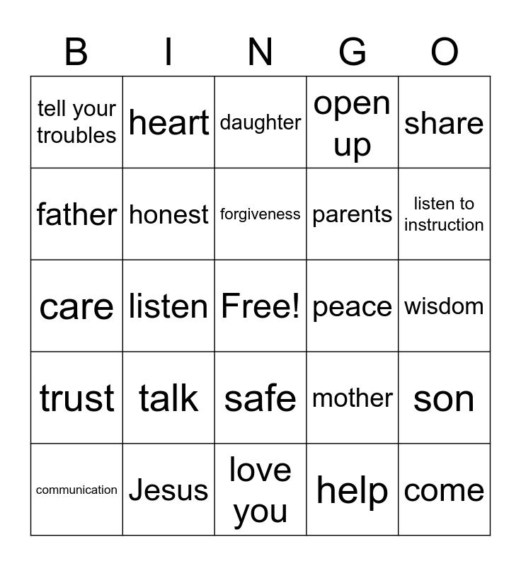 This bingo card has a free space and 24 words: communication, talk, forgiveness, help, share, tell your troubles, heart, daughter, peace, wisdom, care, honest, mother, son, father, Jesus, love you, open up, listen to instruction, trust, listen, safe, parents and come.